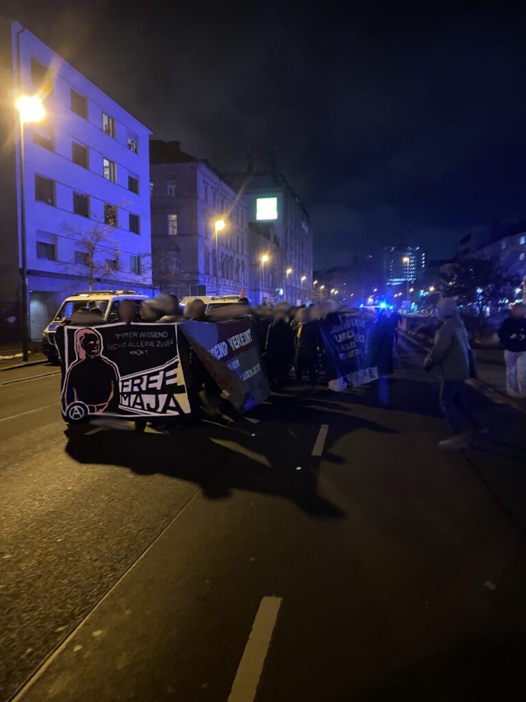 Gestern waren wir mit ca. 200 Antifaschist*innen in Nürnberg auf der Straße. Mit viel Feuerwerk und lauten Parolen zeigten wir uns solidarisch mit Maja und allen von Repression betroffen. Denn 8 Jahre Haft, ob in Ungarn oder in Deutschland, sind 8 Jahre zu viel.